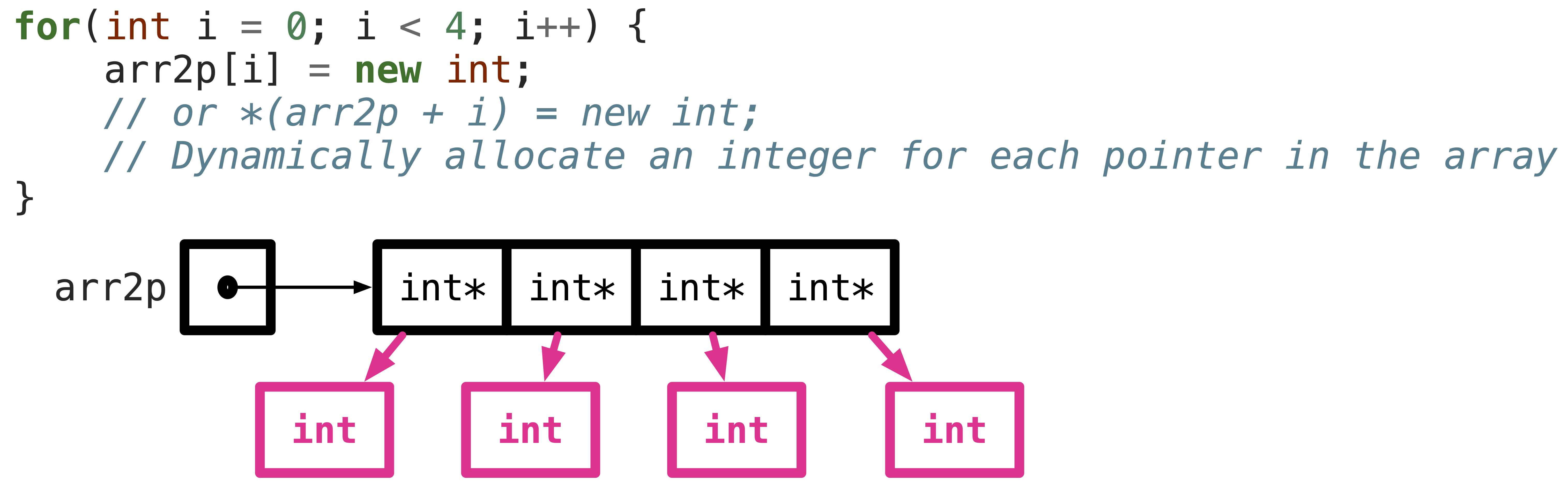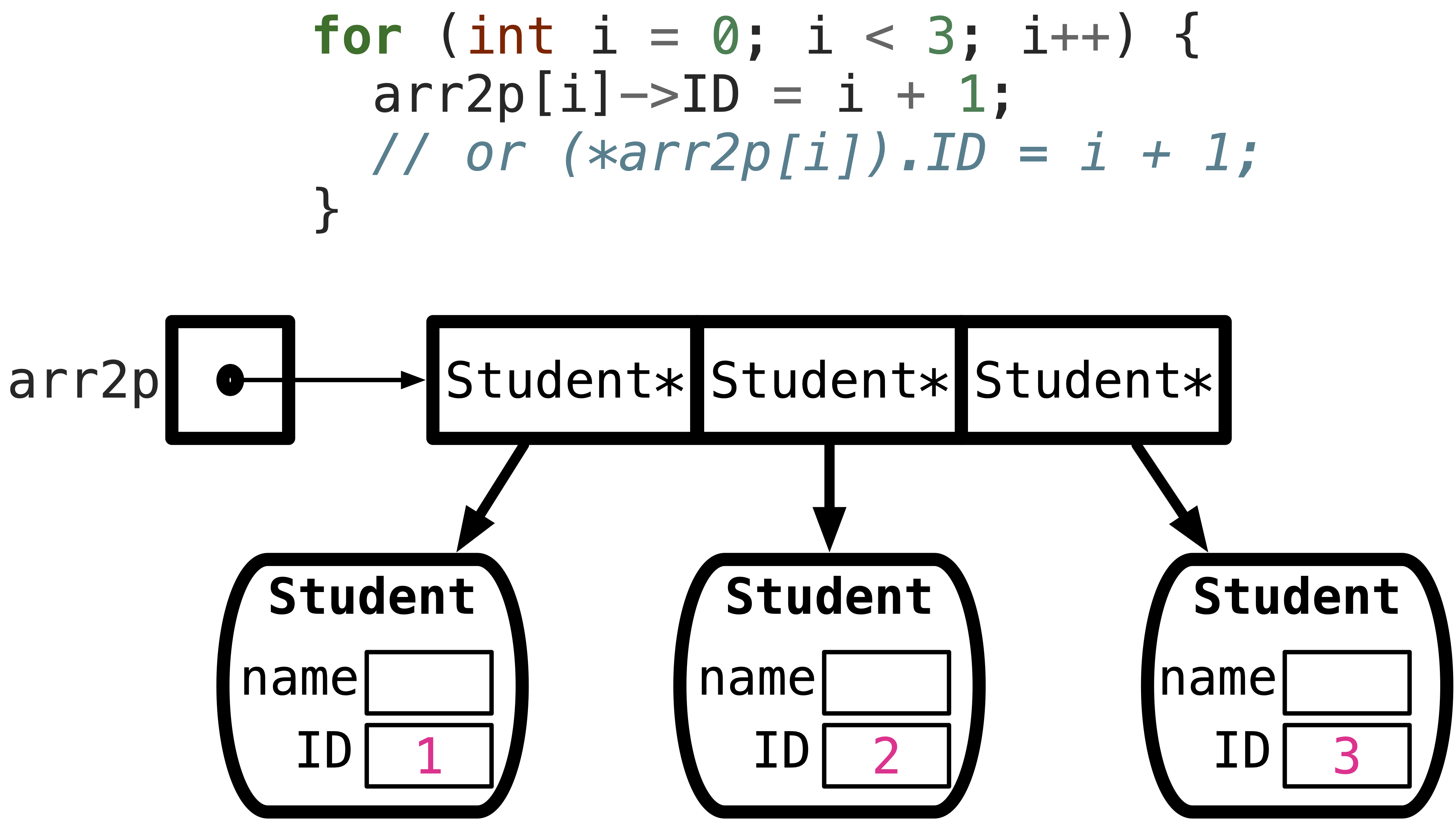 is the number of pointers we want to create. This returns the address of the first element of the array, which we can store in a double pointer variable Student** arr2p