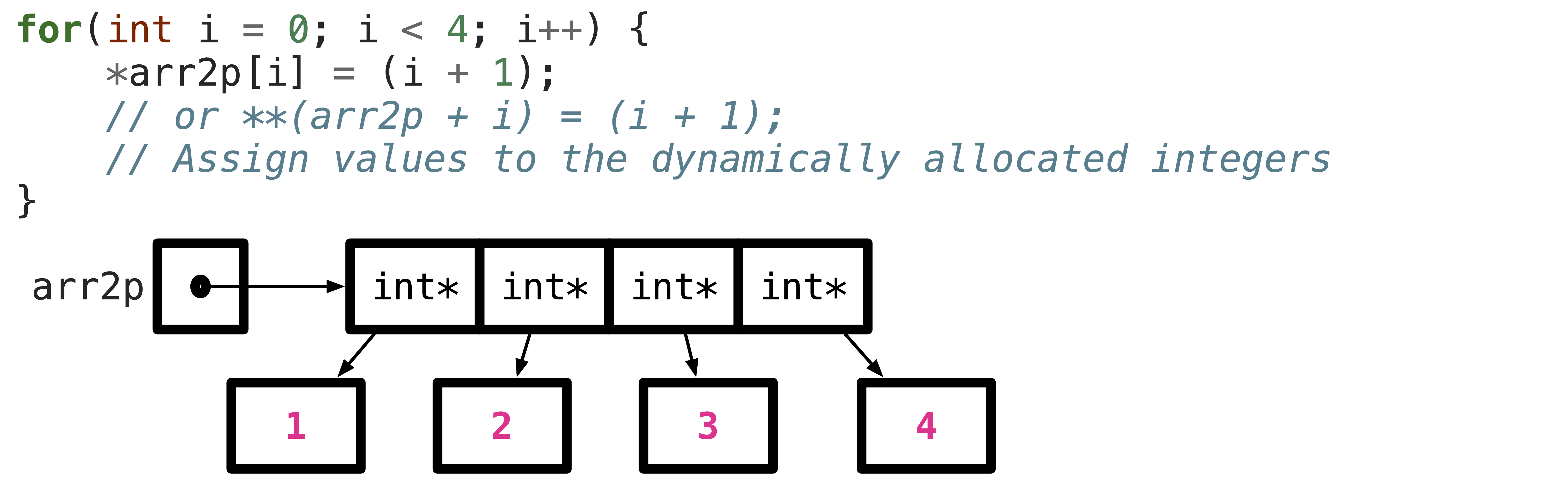 Step 3: We can then assign values to each integer using the pointers in the array. We can dereference each element in the array using *arr2p[i]
